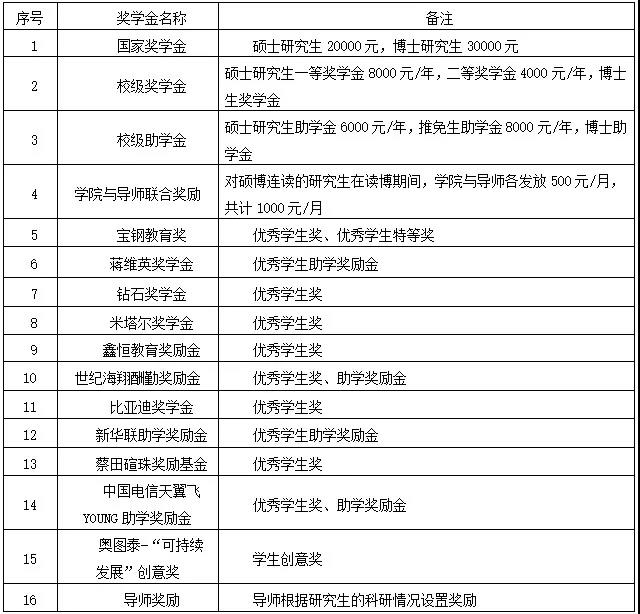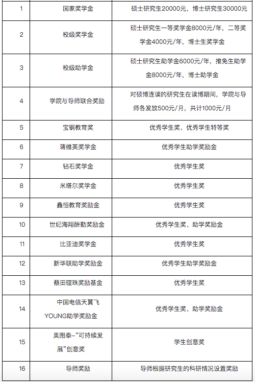 学校研究生奖助学金包括:研究生国家奖学金、研究生学业奖学金、拔尖博士生校长奖学金、研究生助学金、校级奖励金等。研究生可同时申报研究生学业奖学金、研究生国家奖学金、拔尖博士生校长奖学金和各项校级奖励金,但不能同时获得研究生国家奖学金和各项校级奖励金;