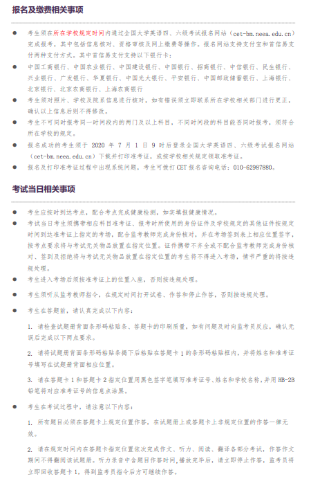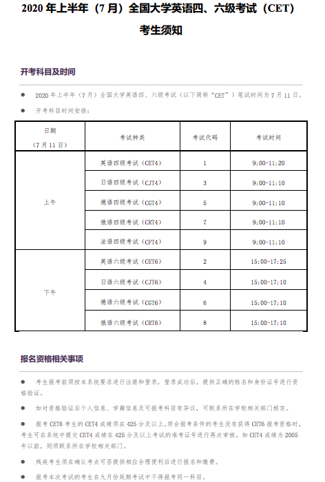 据教育部考试中心此前通知,原定于2020年6月13日举行的全国大学英语四、六级考试延期并分两次举行,考试日期分别为7月11日和9月19日。